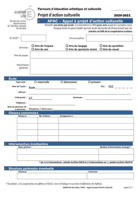 Vous êtes ici : Accueil / Parcours des élèves / PEAC / Documents PEAC-62 / Aide aux projets APAC / APAC 62 Formulaire
